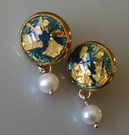 24 KT gold and vitreous enamel in a sterling silver setting with 18KT gold rim. Sterling ear wires. Fresh water pearls.