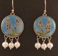 Fine silver and vitreous enamel in a sterling silver setting. Sterling ear wires. Fresh water pearls.
